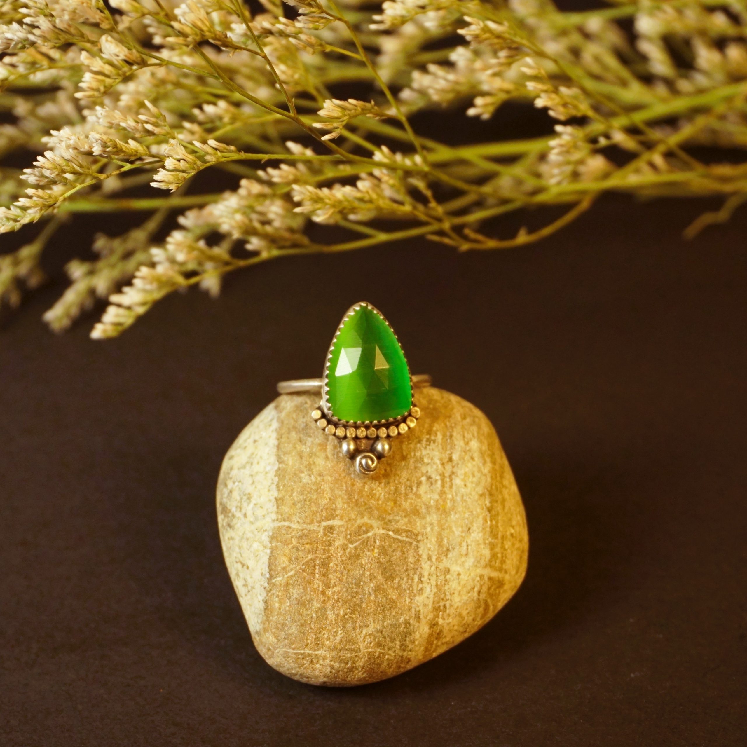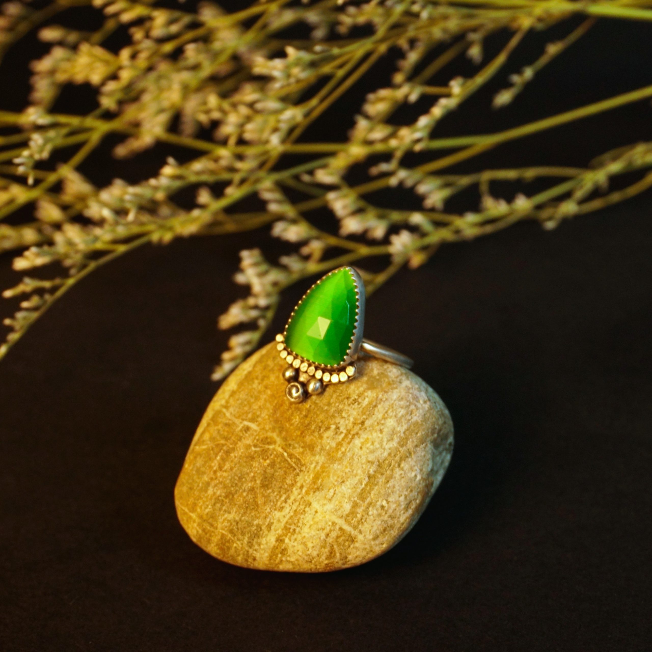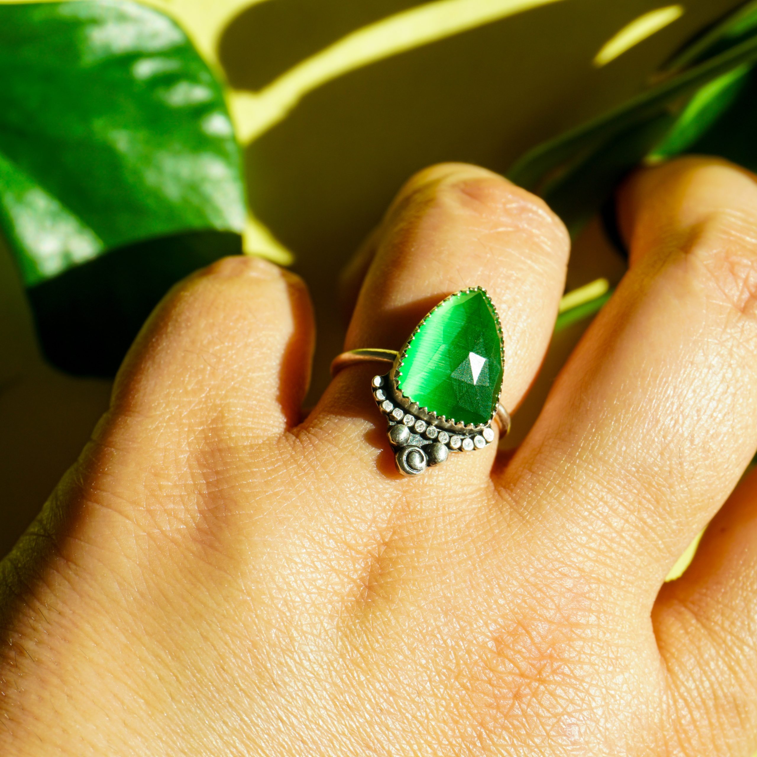The Sacred Leaf Relic Ring features a Green Monalisa stone, a vibrant rose-cut shield gemstone that sparkles with a mesmerizing green, reminiscent of dew-kissed leaves on a spring morning. Set into a hand-fabricated sterling silver band, each curve and texture reflects the slow, intentional process of artisan metalwork.