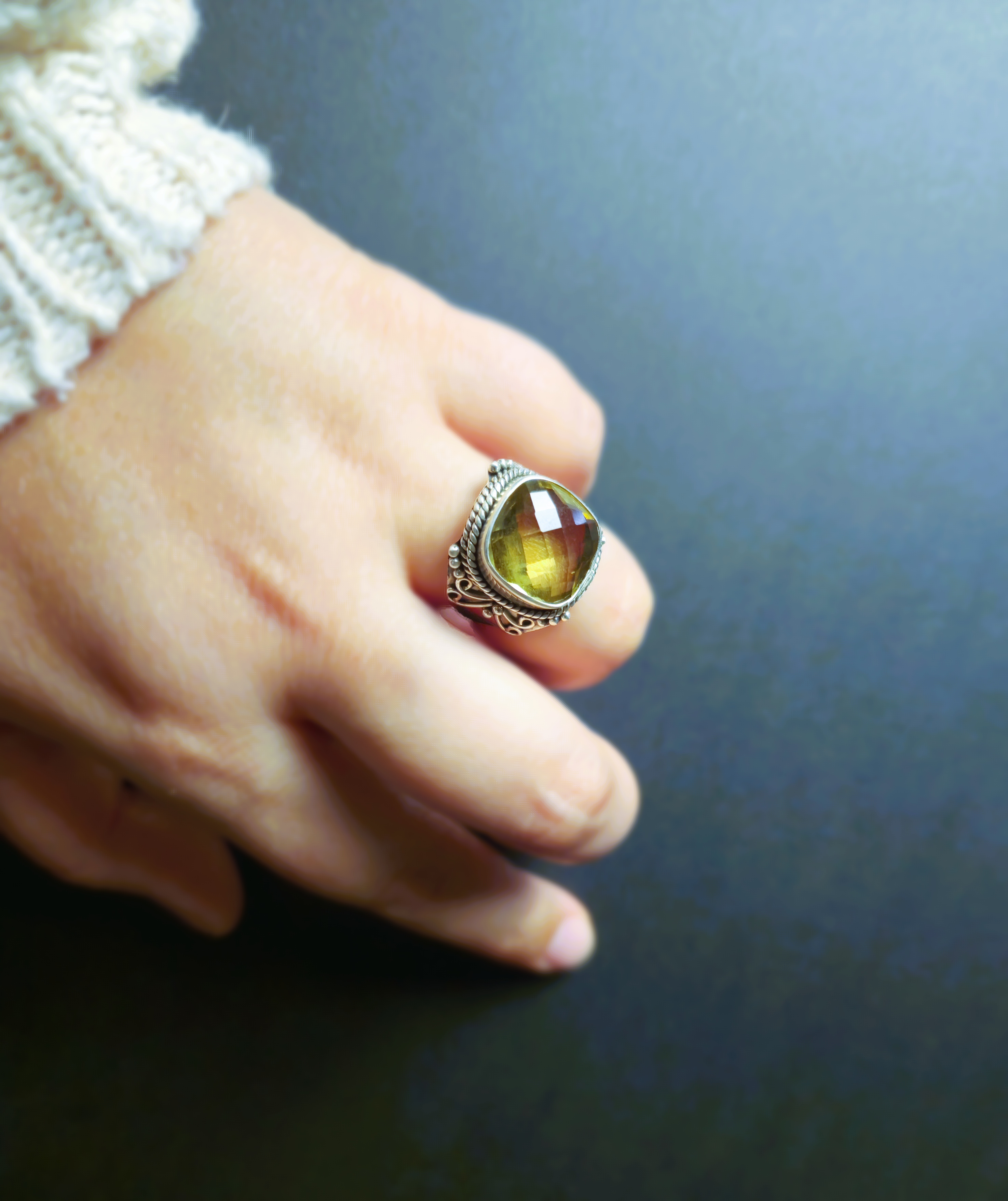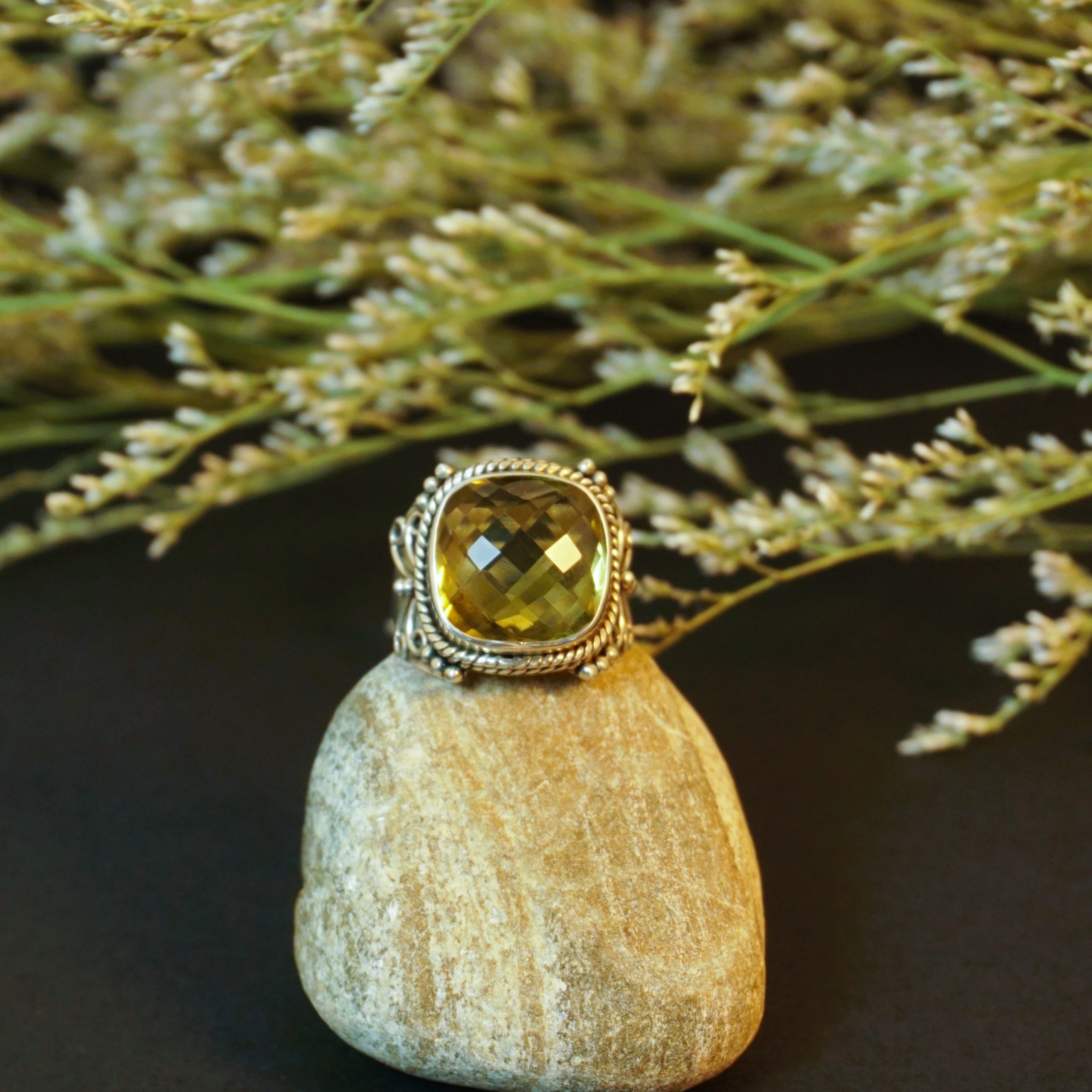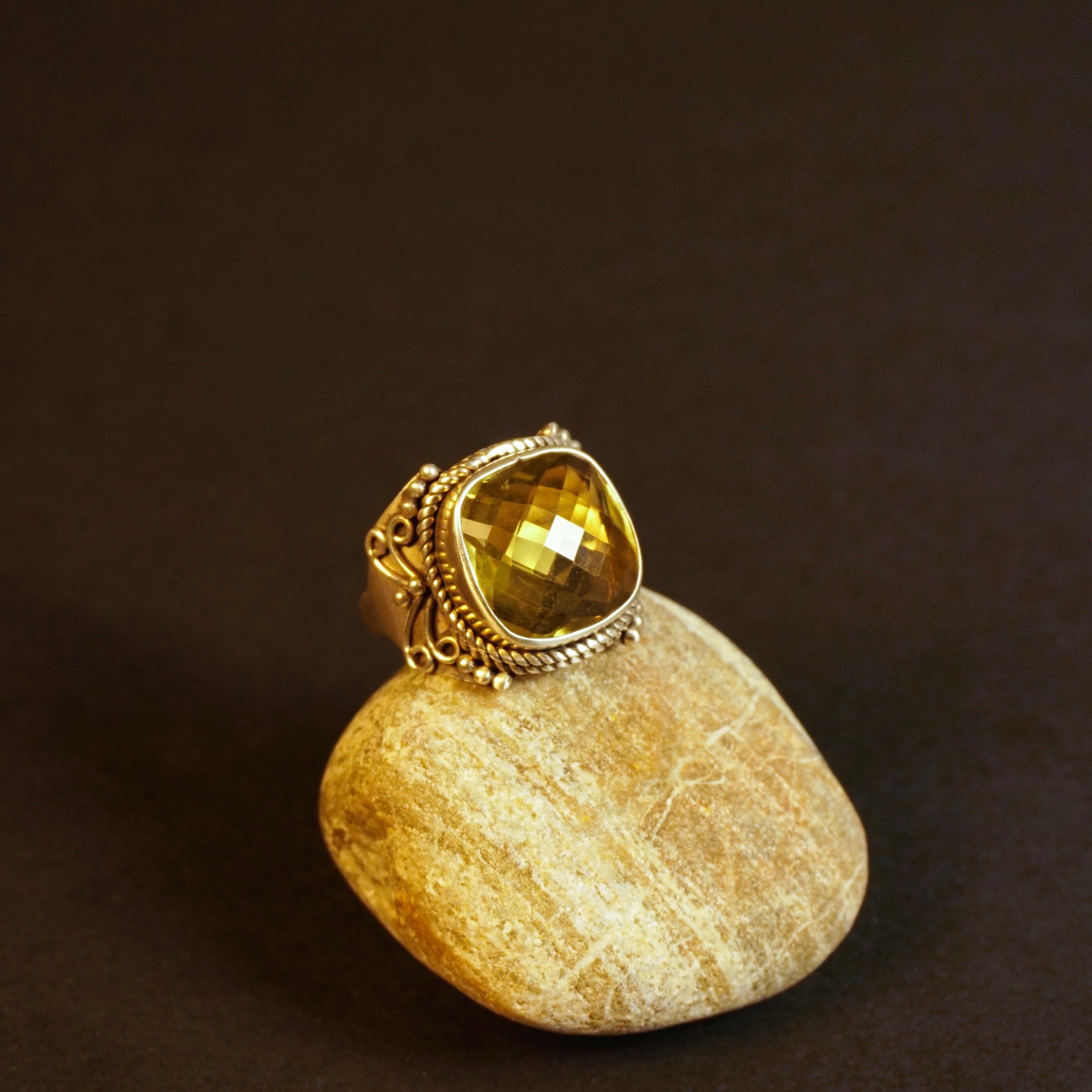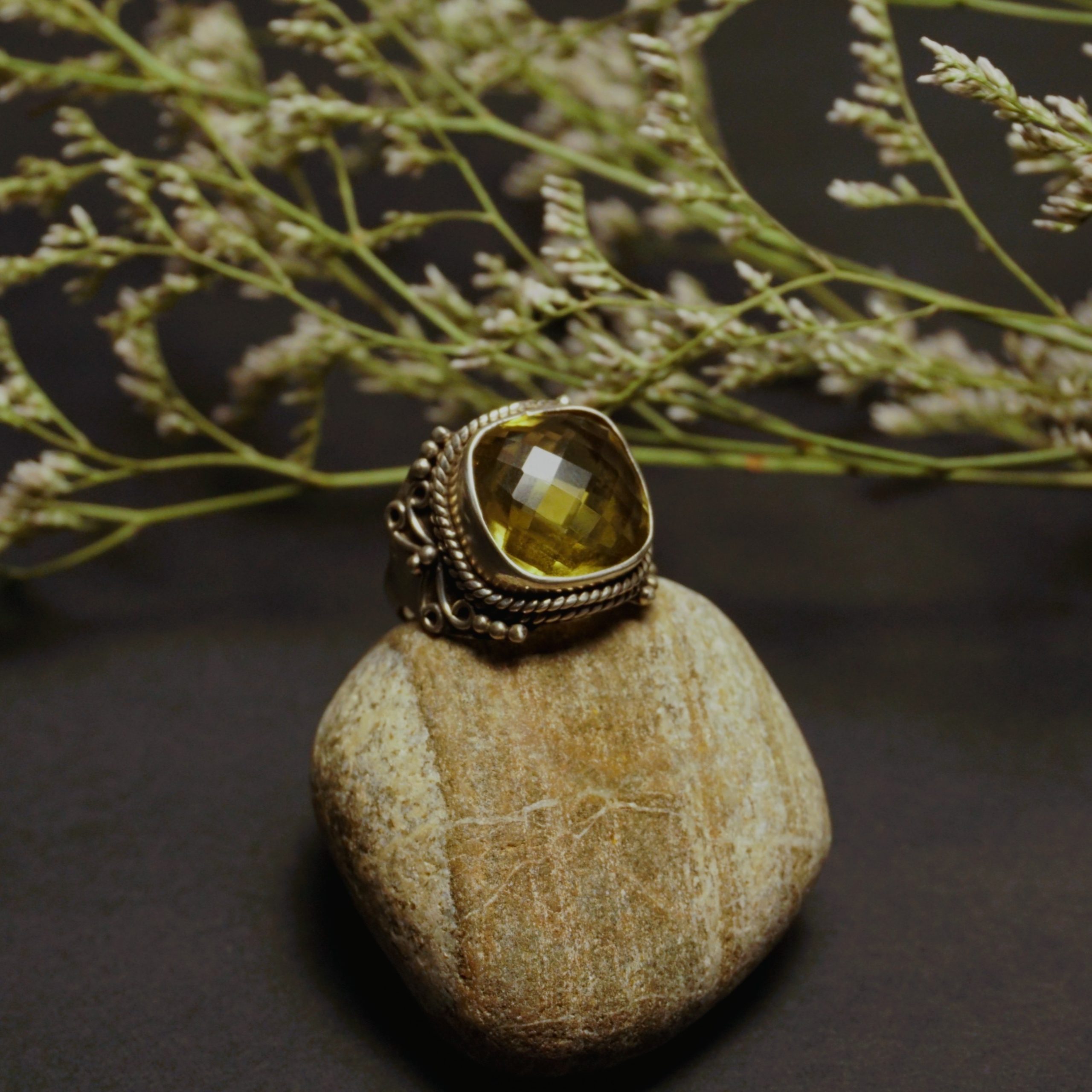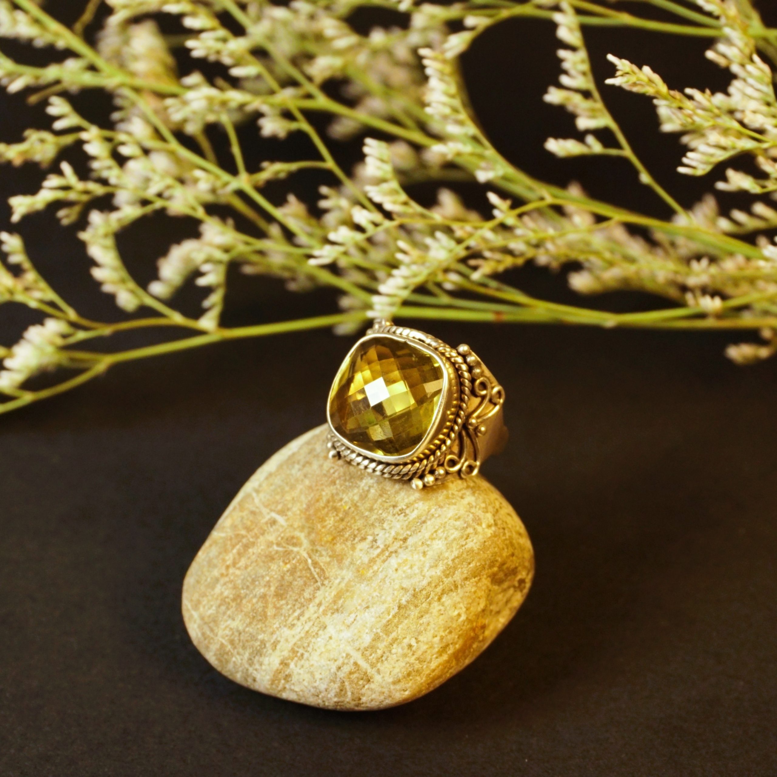 This Sterling Silver Lemon Quartz statement ring is a dazzling tribute to timeless elegance. Featuring a faceted lemon quartz gemstone, its golden glow catches the sunlight, sparkling like a fireball of liquid sunshine. The intricate Art Deco-inspired design adds a touch of vintage sophistication, making it a striking centerpiece for any jewelry collection.